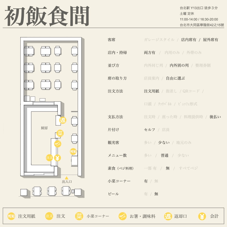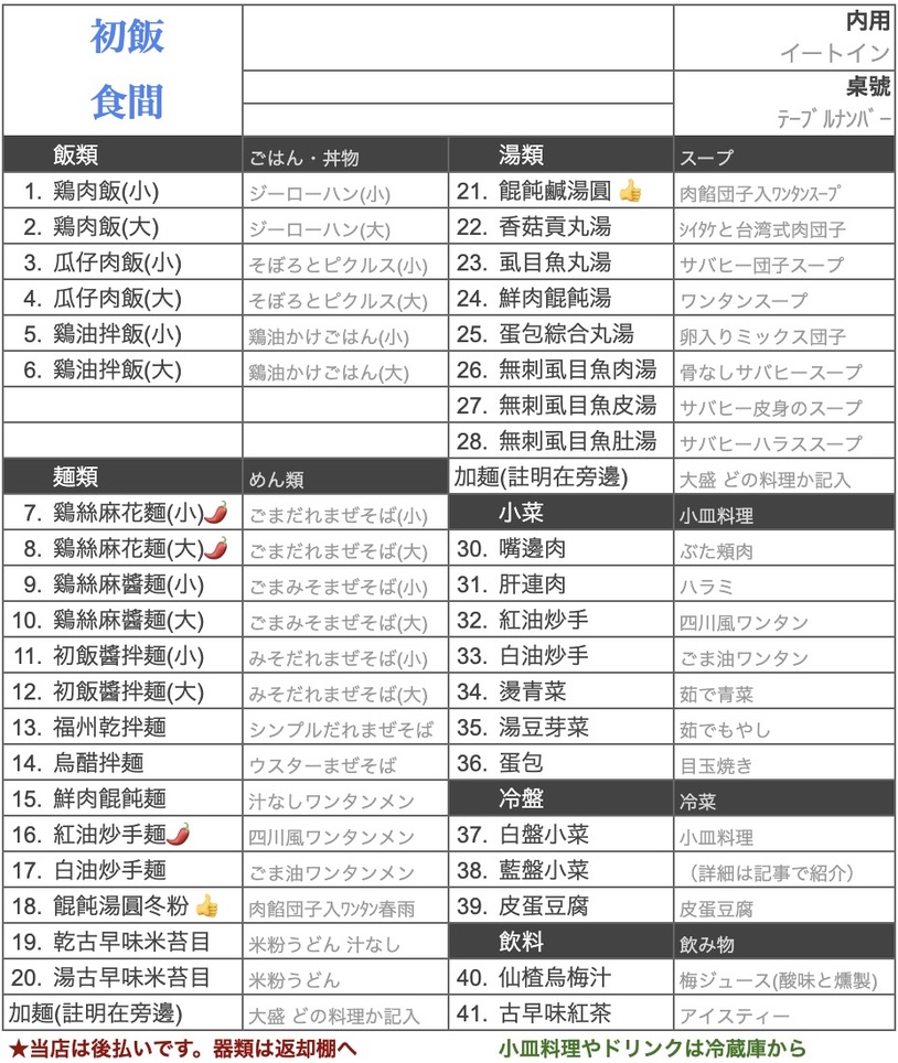初飯食間は台湾旅行初心者さんや3〜4人組におすすめです。なにせ店内が清潔きれいでおしゃれ。さらに扱う食材の幅があるし大皿料理でもないので各自好きなものをお手頃価格で注文できます。立地も台北駅圏内で、ホテルも多いエリアなので利用しやすい方も多いと思います。今回食べた2つの料理、どちらも美味しかったです。ジーローハンは茹で鶏が丁寧にほぐされていて、色合いや味わいからも新鮮さが伝わります。タレの塩梅も抜群でフライドエシャロットの香ばしさが最高のアクセント。麻醬麺は、濃厚なごまペーストの風味が口の中で一気に広がり、後から花山椒のさわやかさが鼻にすーっと抜けていきます。山椒の痺れ系はそこまで得意でないですが、最後まで美味しくいただけました。台湾のローカルグルメに興味があるけどなかなか一歩踏み出せなかった方におすすめの良店です。みなさまもぜひチャレンジしてみてください!!